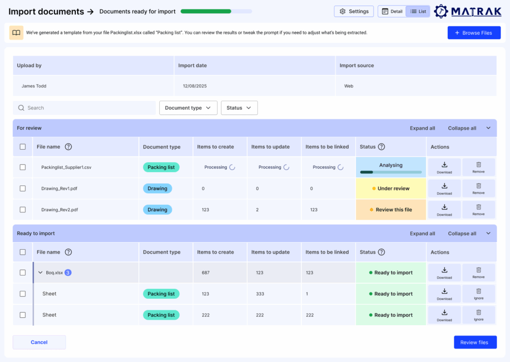 Whether it’s hundreds of rows in a supplier list or multiple inconsistent files, Matrak transforms them into accurate, import-ready data you can use immediately for tracking, reporting, and ordering.