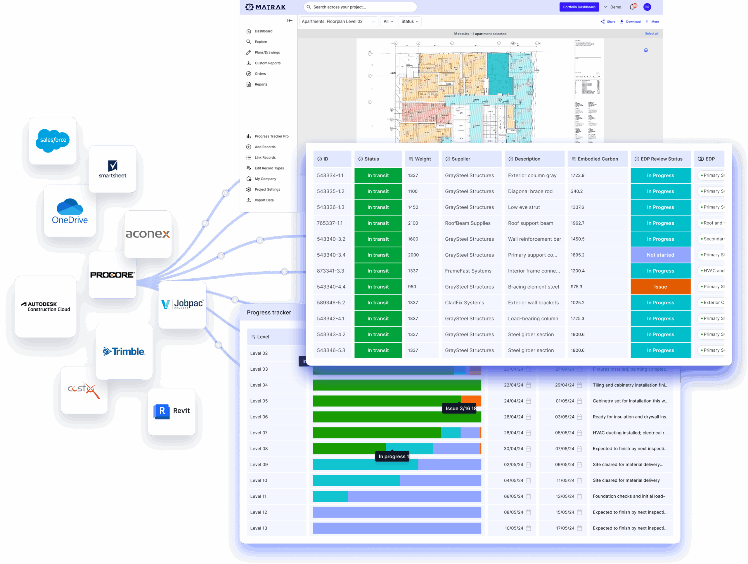 Matrak syncs with your BIM model to provide 3D tracking. With a host of integrations, Matrak’s data is available wherever you need it: Autodesk Construction Cloud, Procore, Microsoft Power BI, Dynamics, SAP, Morta dRofus, BuildAI, Google, Ynomia, and even Excel.
